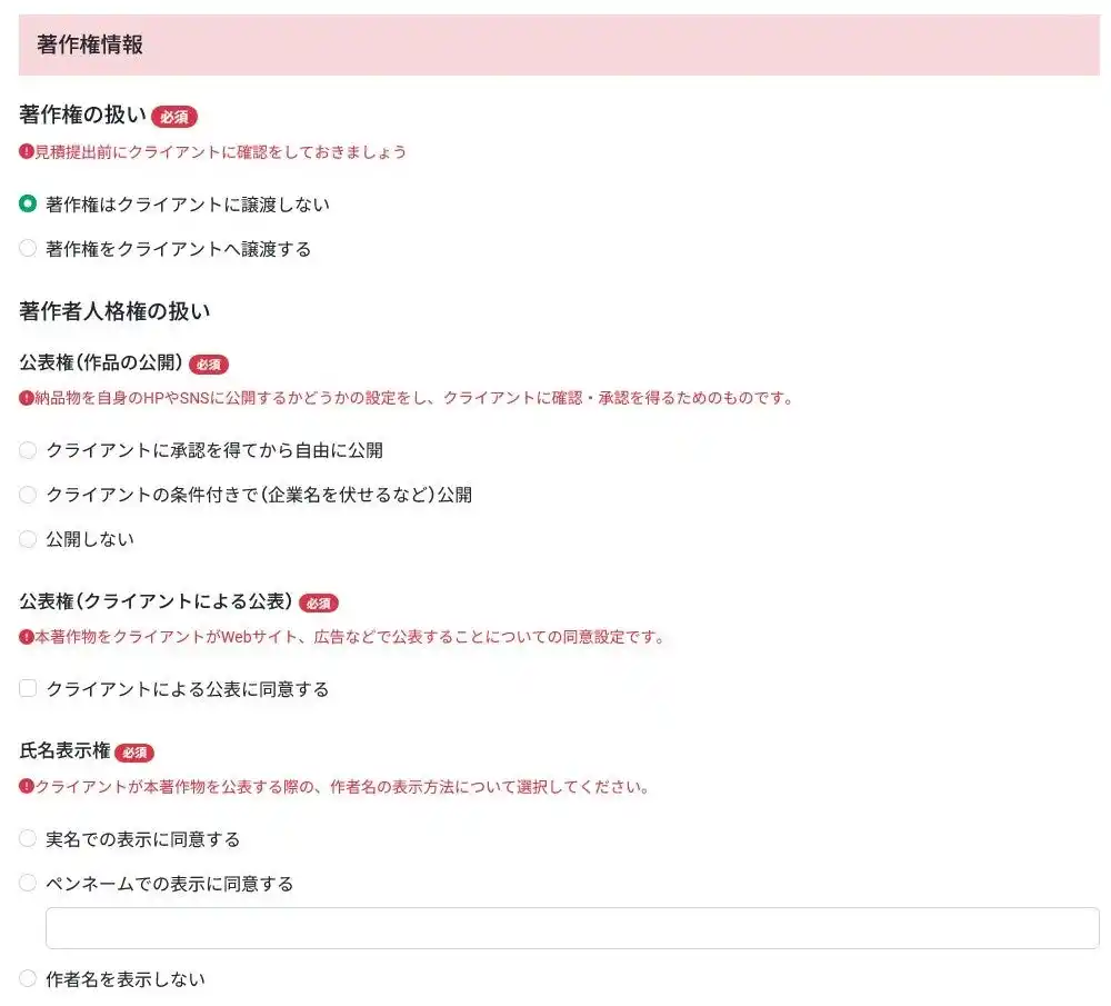 これまで曖昧になりがちだった権利や利用条件を見積り段階で整理できるため、後からのトラブルや追加説明の負担を減らし、スムーズに取引を進められるようになります。 |
