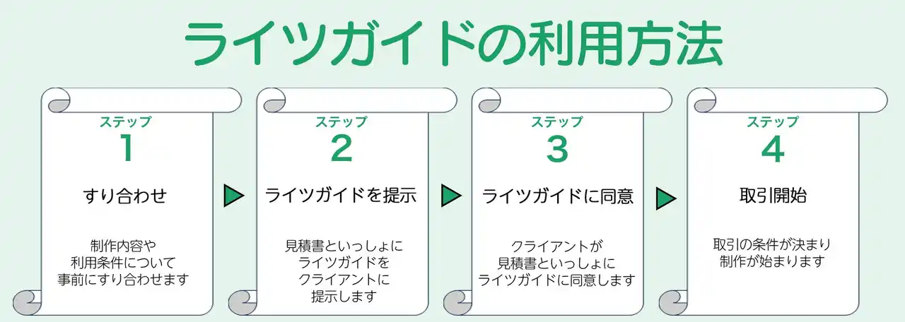 クリエイターが見積書とあわせてライツガイドを提示 著作権の扱い、利用範囲、改変の可否などを明確にしたライツガイドを、見積書と一緒に提示します。 |