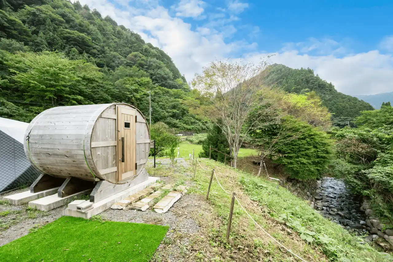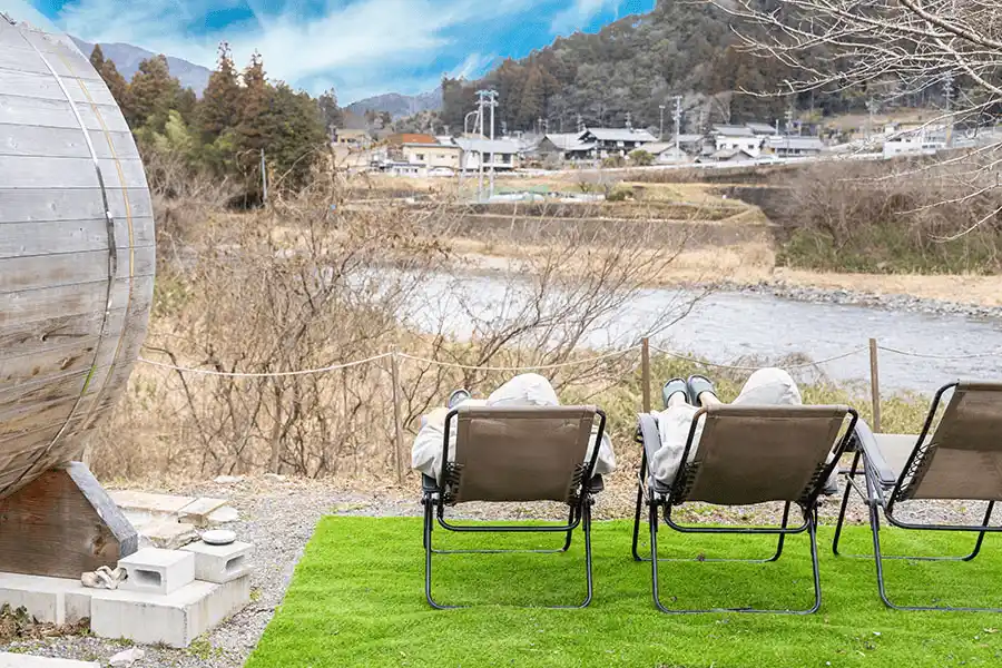 敷地内にはテントサウナやバレルサウナも完備。(有料)じっくりと体を温めた後は、すぐそばを流れる清流へ。広大な長良川をまるで天然の水風呂のように楽しめる、ここでしか体験できない“ととのい時間”をご堪能いただけます。 |