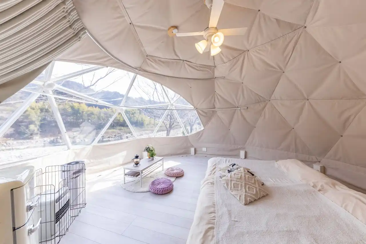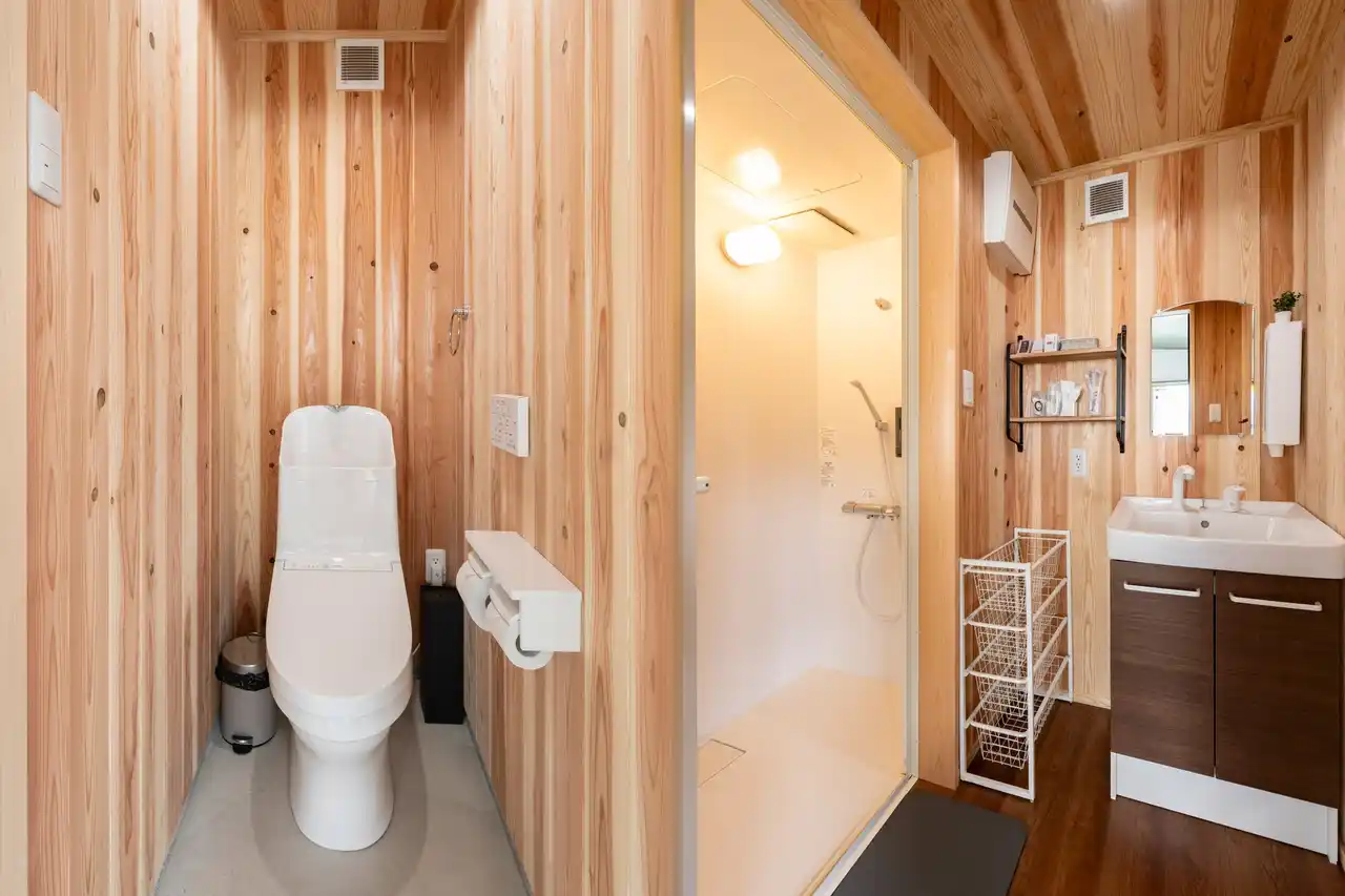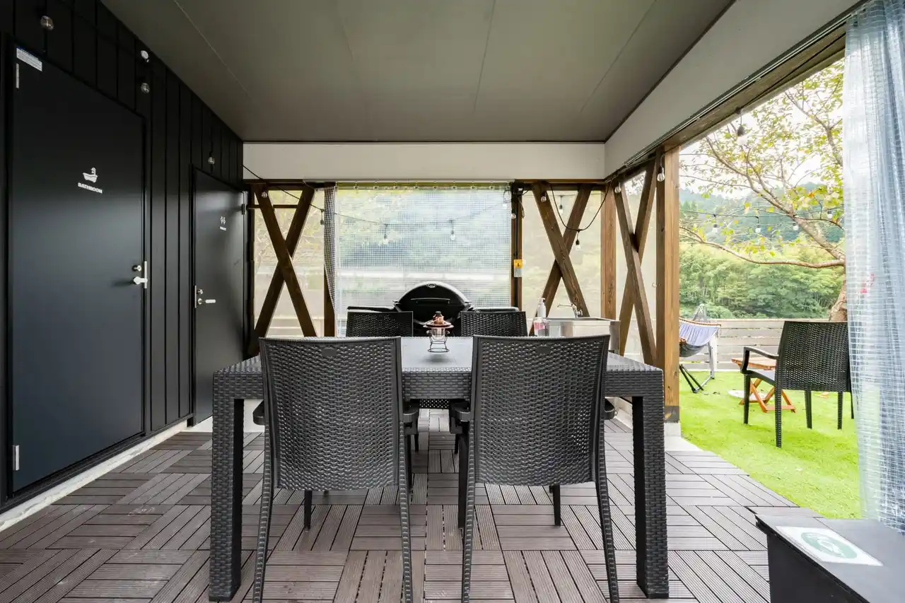 各棟には専用ユニットバス・トイレを完備。さらに専用BBQスペースや充実した客室設備を備えており、アウトドア初心者の方でも安心してご利用いただけます。また全室冷暖房完備のため、季節を問わず一年中快適にグランピング滞在をお楽しみいただけます。 |