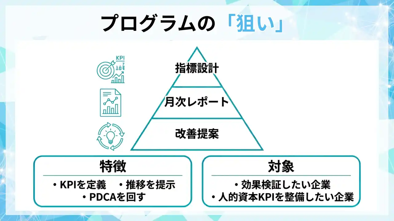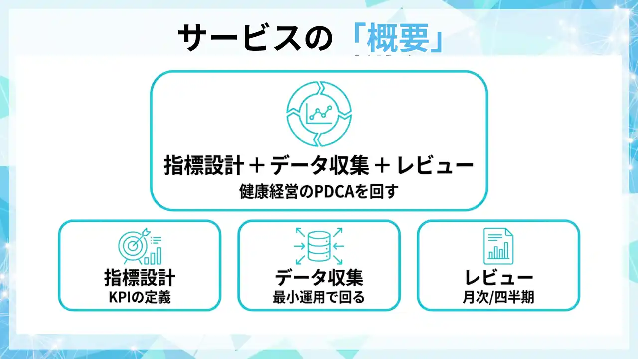指標(KPI)の定義、データ収集、月次/四半期レビュー、改善提案までを一体で整備し、健康経営の取り組みを人的資本KPIへ接続できる運用に落とし込みます。 |