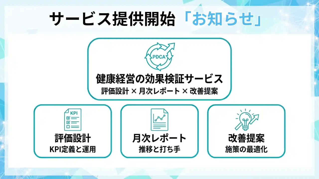 フラクタルワークアウト株式会社(本社:東京都渋谷区、代表取締役:高瀬雅弘)は、健康経営を「施策を実行した」で終わらせず、PDCAを回して投資対効果を説明できる状態にするため、評価設計と月次レポートを標準化した健康経営の効果検証サービスの提供を開始しました。 |