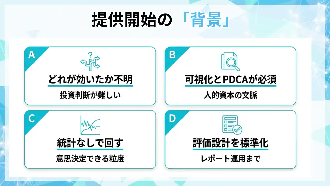 本サービスは、統計分析や高度なデータ基盤がなくても「経営が意思決定できる粒度」で効果検証を回すことを目的に、評価設計とレポート運用を標準化します。 |