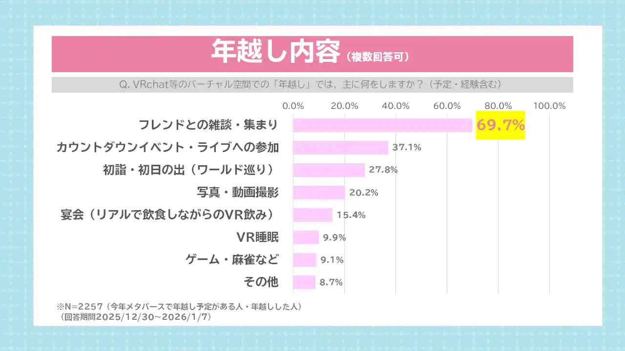 ソリューション提供開始に先駆け、株式会社Vの運営体制のもと、同社がパートナー契約を有するメタバースプラットフォーム「VRChat」上で「年末の過ごし方」に関するアンケートを実施しました。2025年12月30日~2026年1月7日の間にアンケートモニターを掲示し、全2635人からの回答が集まりました。 |