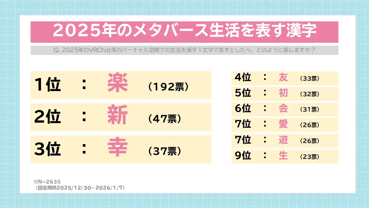 アンケート結果からは、多くのメタバース生活者が「フレンドとの雑談・集まり」を行いながら、年越しをしている様子や、2025年を振り返って「楽」などのポジティブな漢字を思い浮かべる人が多いことがわかりました。 |
