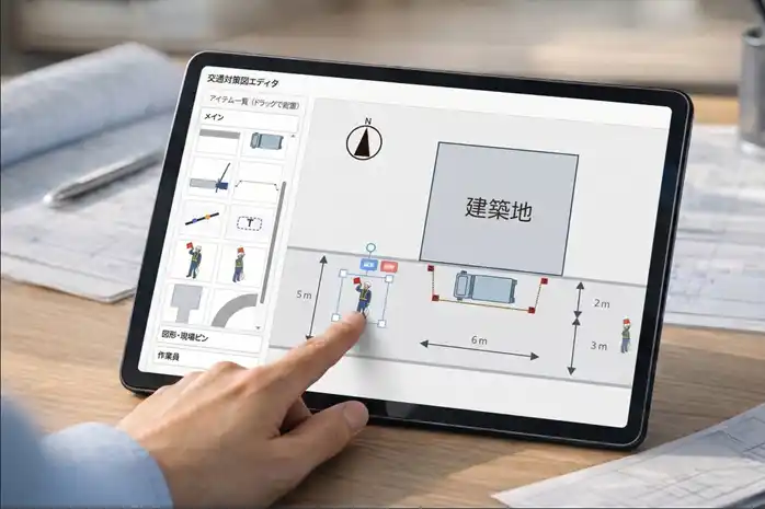 5)交通安全対策図を、誰でも簡単に作図 あらかじめ用意されたパーツを、直感的なドラッグ&ドロップ操作で配置するだけで、交通安全対策図の作図が可能です。専門ソフトがなくても作成でき、作図の手間や属人化の解消に貢献します。 |