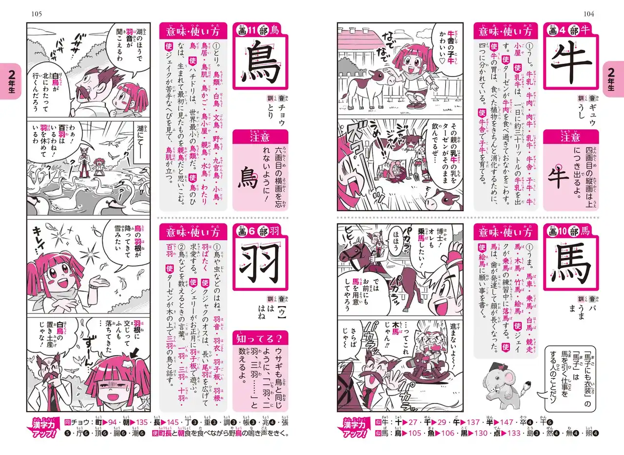 | 小学生に大人気の『どっちが強い!?』のキャラクターたちが登場する巻頭のカラーまんがと、2~4コマほどの爆笑まんがで、1・2年生で学習する漢字240字を紹介。すべての漢字をまんが化しているので、楽しく何度も読み返し、自然と漢字を覚えられます。 | |||