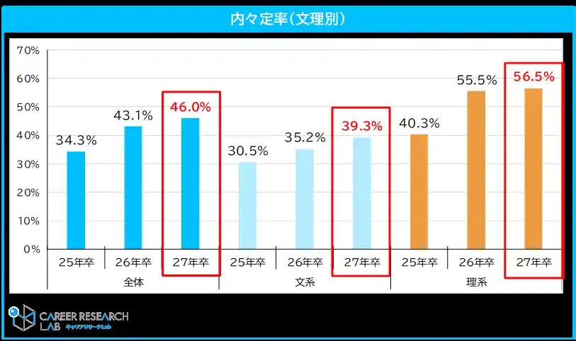 ◆27年卒の内々定率は前年比2.9pt増の46.0%。理系学生は56.5%と過半数が内々定を保有 |