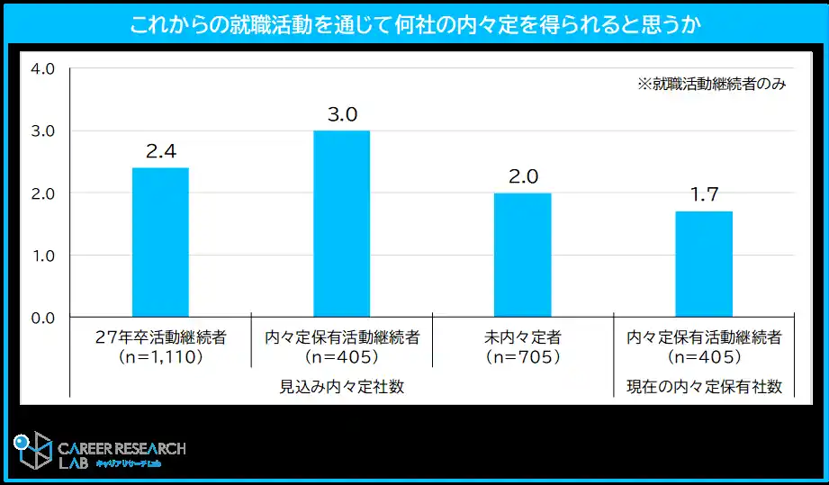 就職活動を継続する学生が考える「内々定社数の見込み」は平均2.4社。内々定保有者も平均3.0社の内々定を得られると見込んでいる