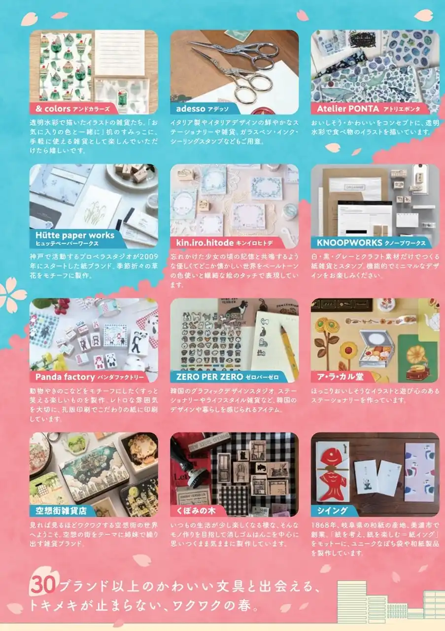 | クリエイターやメーカーなど30ブランド以上が出店し、個性あふれるかわいい文具を展開します。「桜色」をテーマカラーに桜モチーフや春らしい華やかなアイテムが大集合。ノートや便箋、グリーティングカードや小箱などのペーパーアイテム、スタンプなどの文具を取り揃えるほか、カスタマイズできる一品や東京ならではのアイテムも登場します。 | ||||||||||||||