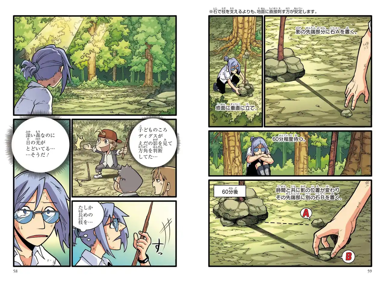 本作でも影の変化から方角を調べる方法など、窮地を生き抜くための知恵が分かりやすく描かれております。 |