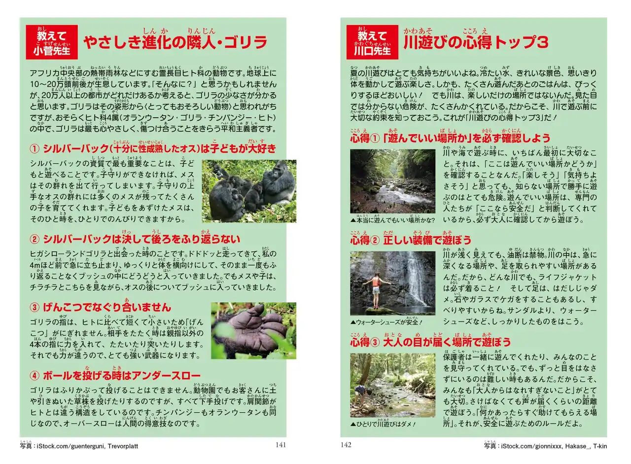 旭川市旭山動物園元園長で獣医師でもある小菅正夫氏と、自然学校「WILD AND NATIVE」を主宰する川口拓氏が監修を務めます。興味深いゴリラの本来の生態や、身近でありながらも危険な川遊びの注意点など、実際に役に立つ情報を収録しております。 |