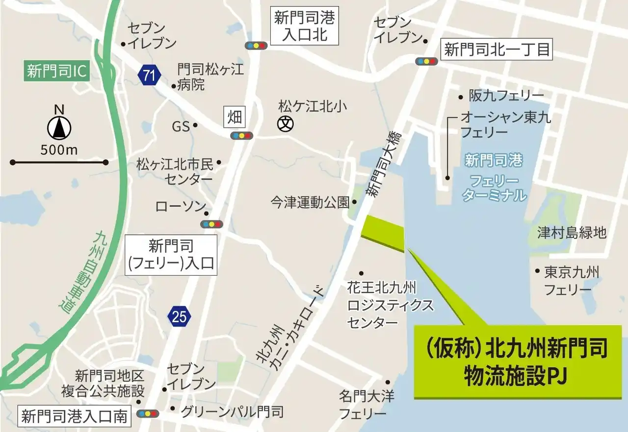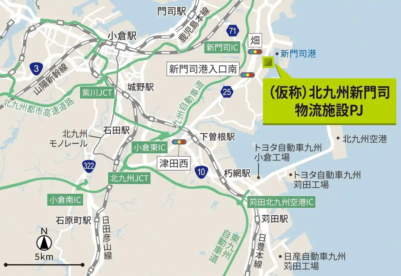 (仮称)北九州新門司物流施設PJは、九州自動車道「新門司」ICから約3.5km、「門司」ICから約6.1kmに位置し、九州圏の一大消費地の一つである小倉駅周辺まで約30分(約14km)で配送することが可能な都市中心部近接型の物流施設です。