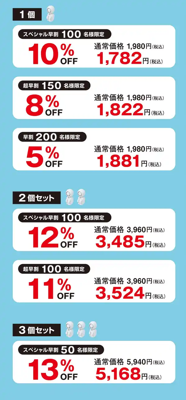 1番おトクな「スペシャル早割」は、3台セットで5,168円(税込)で購入可能! |