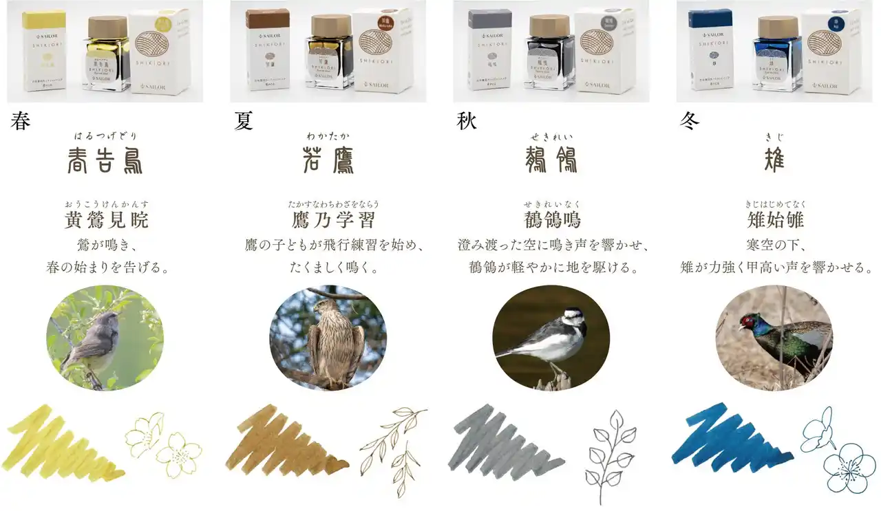 野山に響く鳥たちのさえずりに耳を傾けるシリーズとして、2025年10月に発売したSHIKIORI ―四季織― 野山の唄シリーズの万年筆・ボールペンに続く万年筆用インク。 |