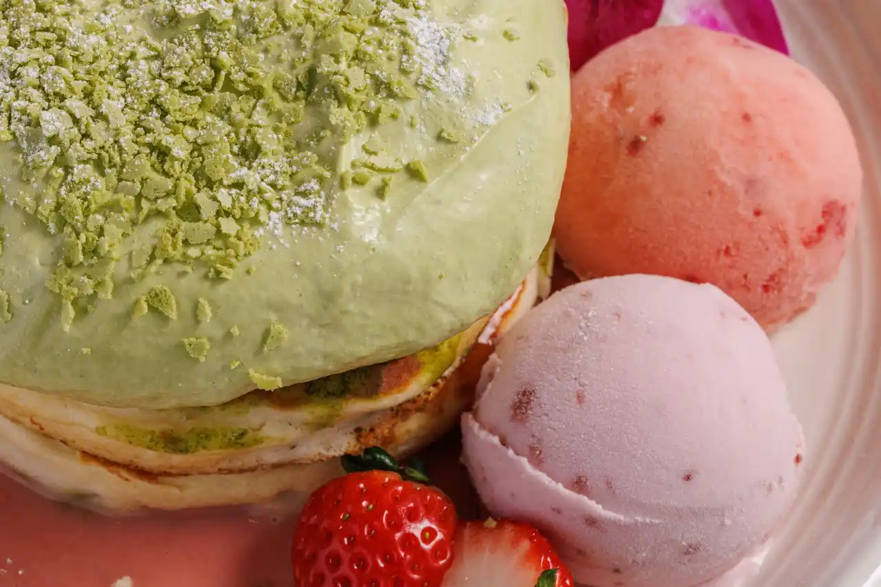 ふわふわのパンケーキに、抹茶が香るクリームと、ストロベリーココナッツソースを合わせた、春らしい彩りの一皿。 |