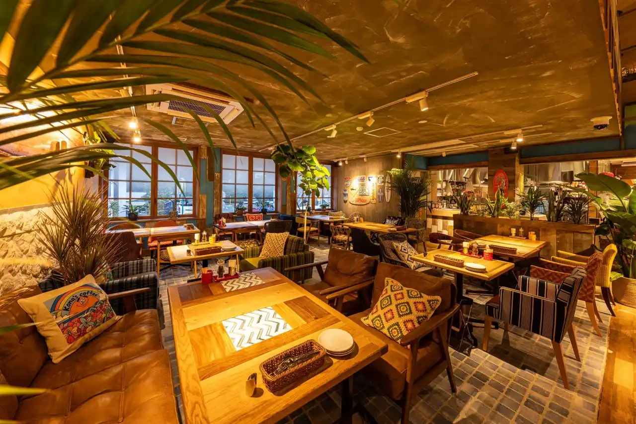カラフルなハワイアン雑貨やサーフボードが飾られ、遊び心のあるソファやテーブルなどのこだわりのインテリアが、まるで、ハワイのローカルのリビングにいるような雰囲気を演出します。ゆったりとくつろげる空間で、日本にいながらハワイ気分を味わえます。 |