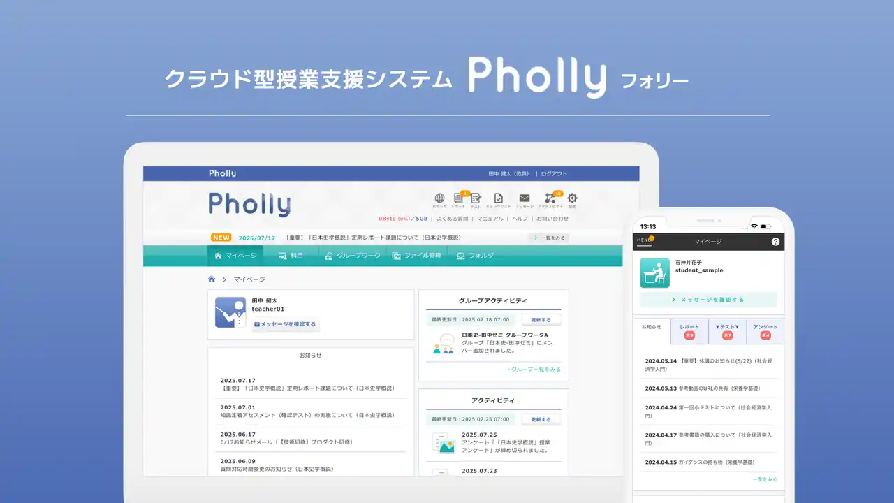 Phollyは、大学や専門学校を中心にご利用いただいている授業支援システムです。業界最安値帯の料金プラン、最短1か月から利用できる柔軟さが特徴です。 |