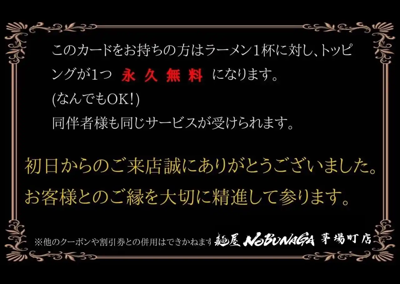 | ご来店いただいたお客様全員に【永久無料トッピング券】をお渡しいたします! | |||||||||||