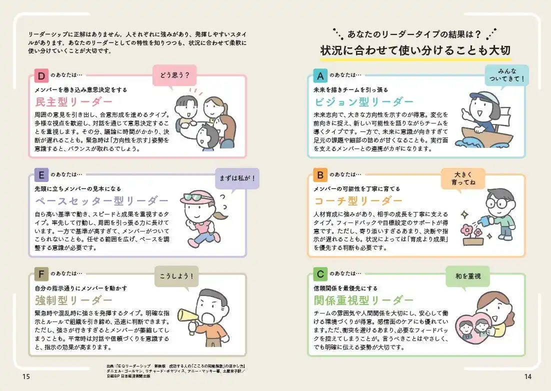 「グイグイ引っ張るカリスマ性がないとリーダーにはなれない」……そんな思い込みは今日で終わりです 。本書掲載の「リーダータイプ診断」では、あなたの特性を「ビジョン型」「コーチ型」「関係重視型」など6つのスタイルで可視化します 。 |
