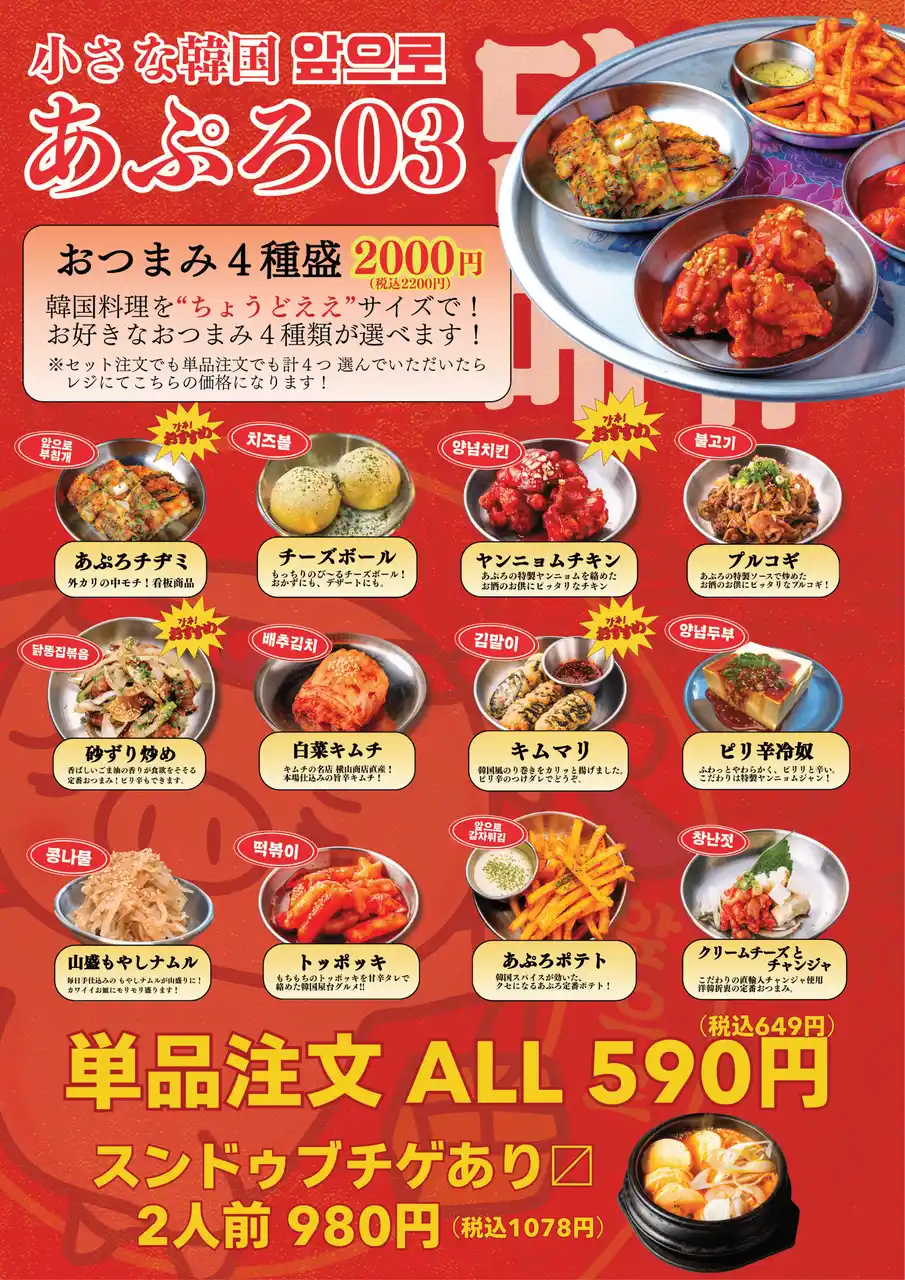 | 仕事帰りのサク飲みに向けて、チヂミやトッポギなどの韓国屋台メニューを600円台から提供し、おひとり様や少人数でも楽しめる小皿メニューやおつまみを拡充。 | |||||||||