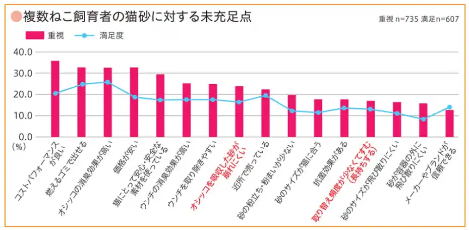 また、こうした複数ねこ飼育者に猫砂の重視点と満足度を調査したところ、オシッコの消臭効果の高さや、オシッコを吸収した砂の崩れにくさ、取り換え頻度を重視するも、現在使用している猫砂では満足できておらず未充足ニーズが存在していることがわかりました。 |