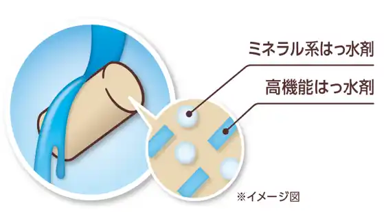 ミネラル系はっ水剤と高機能はっ水剤の2種類のはっ水成分を配合したことにより、オシッコの量が増えてもチップが膨らみにくく、足元をいつもサラサラで清潔な状態に保ちます。 |