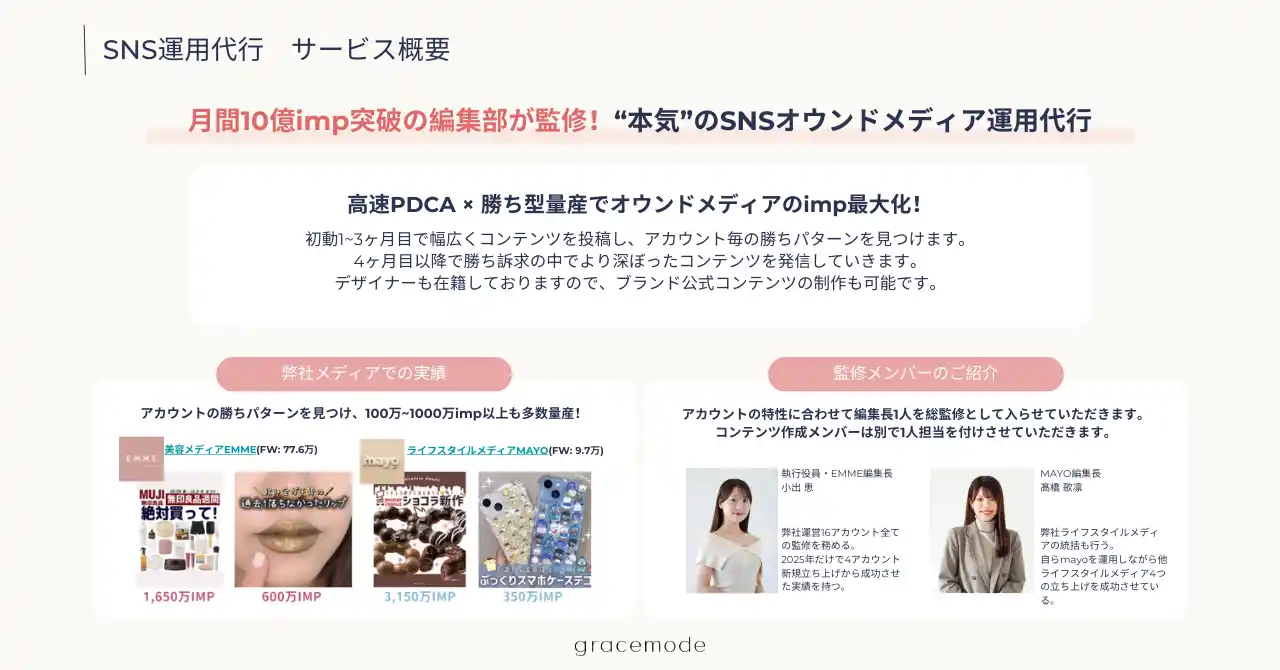 弊社はこれまで、月間10億視聴を突破する自社美容メディアを運営し、目まぐるしく変わるSNS市場の「勝ち筋」をリアルタイムに蓄積してまいりました。こうした中で寄せられた「プロの知見を直接自社アカウントに反映したい」という多くの切実な声に応え、この度、gracemode編集部によるSNS運用支援サービスを本格始動いたしました。 |
