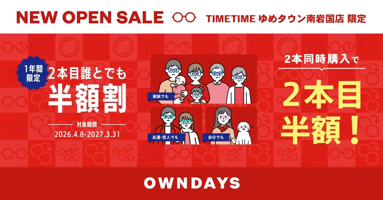 | OWNDAYSでは、「のりかえ割」終了後の2026年4月8日(水)から2027年3月31日(水)まで、毎回ご好評をいただいているオープンキャンペーン「2本目誰とでも半額割」を開催いたします(※4)。本キャンペーンは、ご本人様だけでなく、ご家族やご友人様とでもメガネを2本以上同時にご購入いただくことで、2本目以降がすべて半額になるお得なキャンペーンです。ペアでのご購入はもちろん、シーンや用途に合わせてメガネを使い分けたい方にもおすすめのキャンペーンとなっています。 | ||||||||||