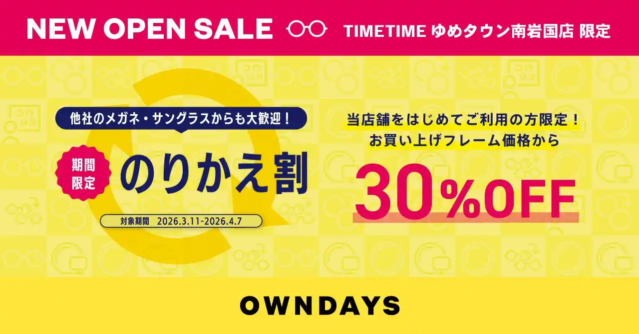| 2026年3月11日(水)から2026年4月7日(火)までの期間、 OWNDAYS TIMETIME ゆめタウン南岩国店を初めてご利用いただくお客様を対象に、フレームが30%OFFとなる「のりかえ割」を実施いたします(※3)。他社ブランドのアイウェアをご愛用中の方に加え、過去に他のOWNDAYS店舗をご利用されたことがある方も、OWNDAYS TIME TIMEゆめタウン南岩国店が初めてであればご利用可能です。 | ||||||||||