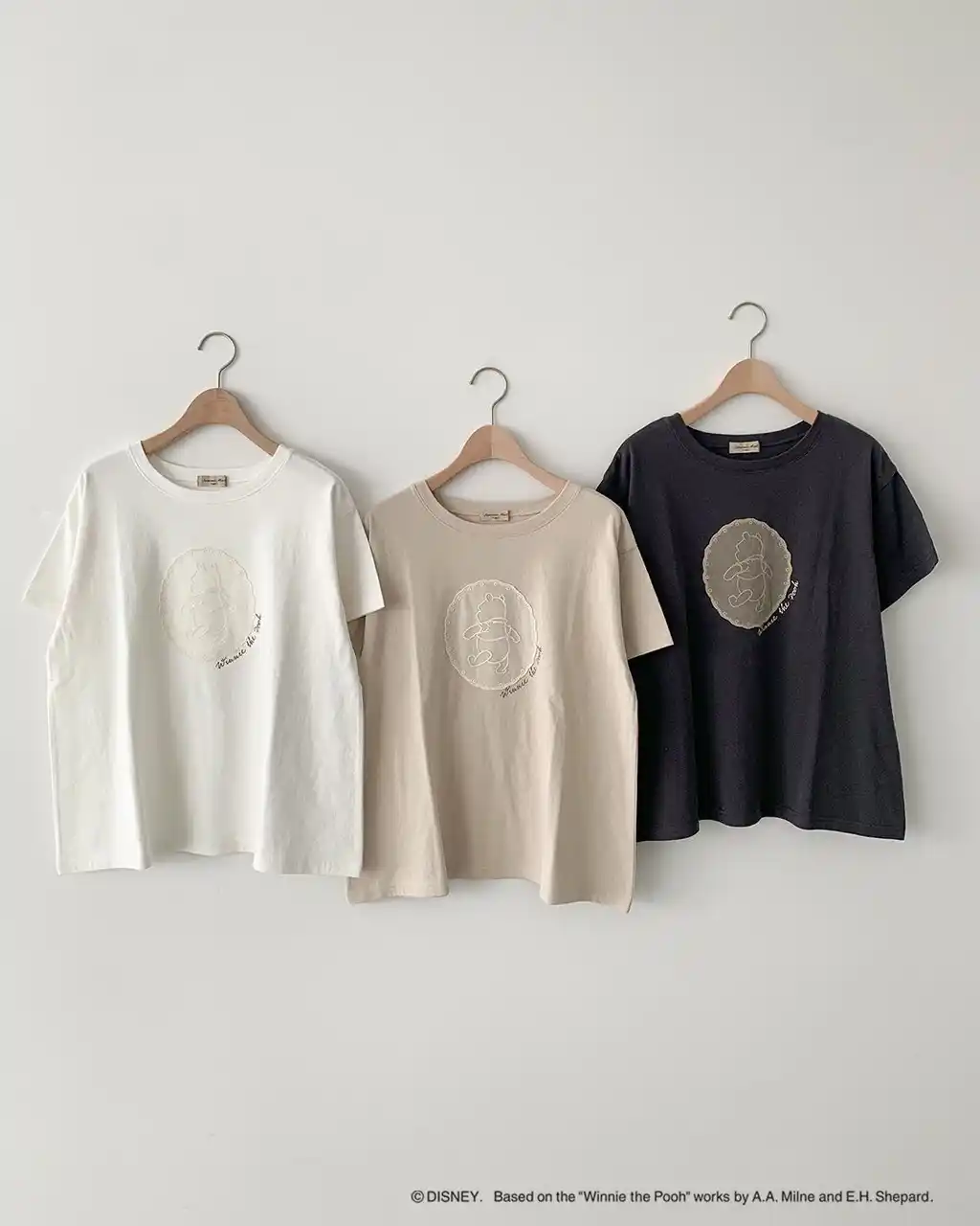 | 袖のフリルがアクセントのロンTには、『くまのプーさん』の原画を思わせるイラストをプリント。はちみつが大好きな「プーさん」がハニーポットを覗き込むような愛らしい姿や、個性豊かな仲間たちとテーブルを囲んでパーティを楽しむ様子など、穏やかであたたかな世界観を表現しました。 | |||||||||
