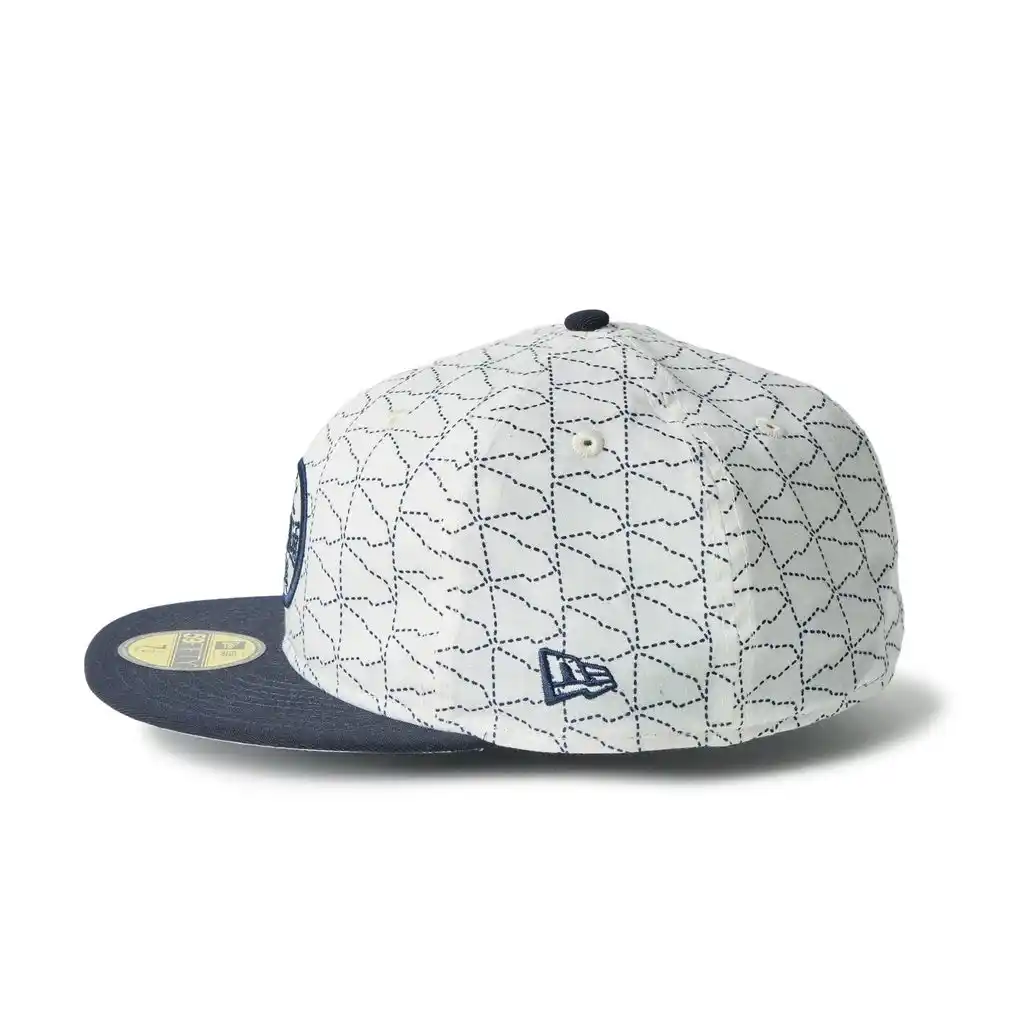 永楽屋が今回のために染め上げた手ぬぐいには、ニューエラのフラッグロゴのアウトラインを刺子調にレイアウトしたオリジナルパターンを採用しています。 |