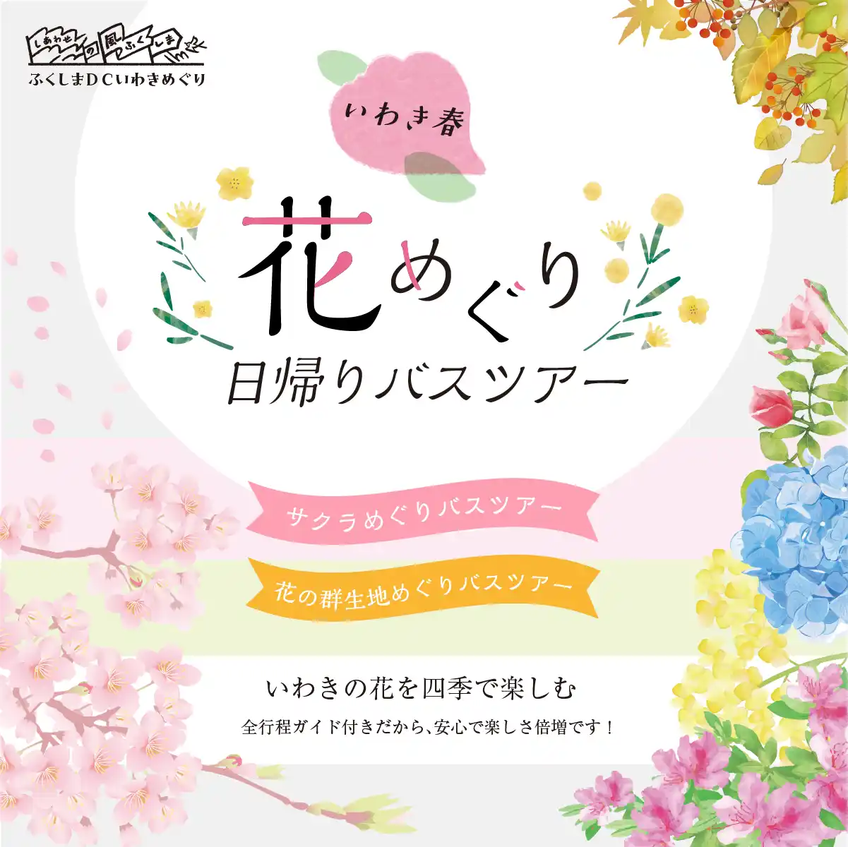 「ふくしまデスティネーションキャンペーン」の開催に合わせて、いわき市の春を心ゆくまで満喫できる特別なバスツアーをご用意いたしました! 全行程、地域の魅力に詳しいガイドが同行してご案内しますので、新しい発見や楽しさがさらに大きく膨らむはずです。 この春は、バスに揺られて、いわき市が誇る美しい桜・花を訪ねてみませんか。 皆さまのご参加をお待ちいたしております。 |