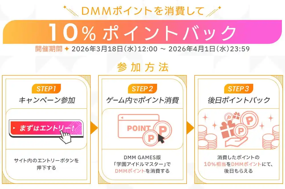 10%ポイントバックの開催期間中に、キャンペーン特設ページからエントリーし、DMM版『学マス』で、DMMポイントを消費いただいた方を対象に、消費ポイントの10%を後日DMMポイント(無償)にて還元します! |