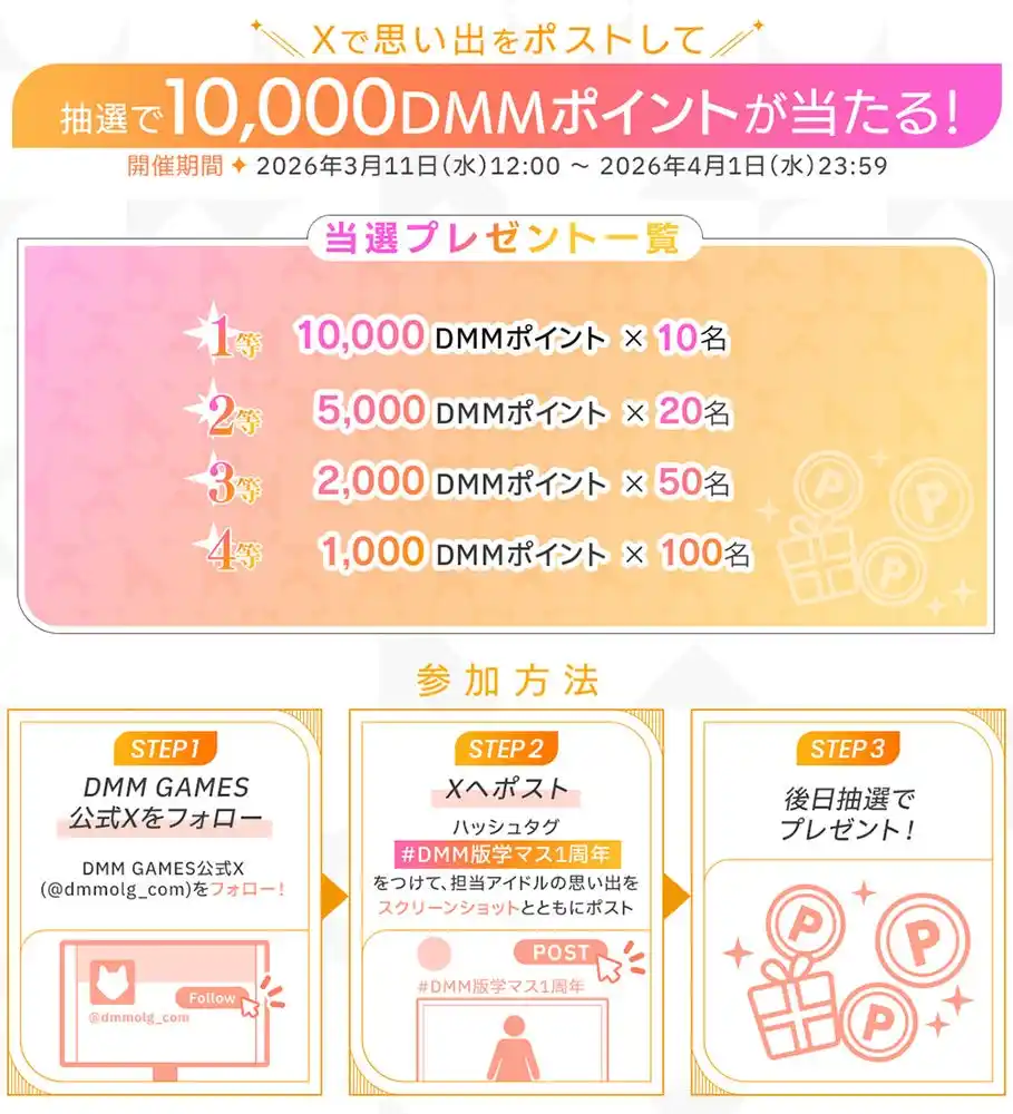 Xのハッシュタグキャンペーンを実施中です。#DMM版学マス1周年をつけて、担当アイドルの思い出とともにスクリーンショットを添付してポストした方の中から、抽選で最大10,000DMMポイントが当たります!ぜひ、『学マス』の思い出を語ってください♪ |