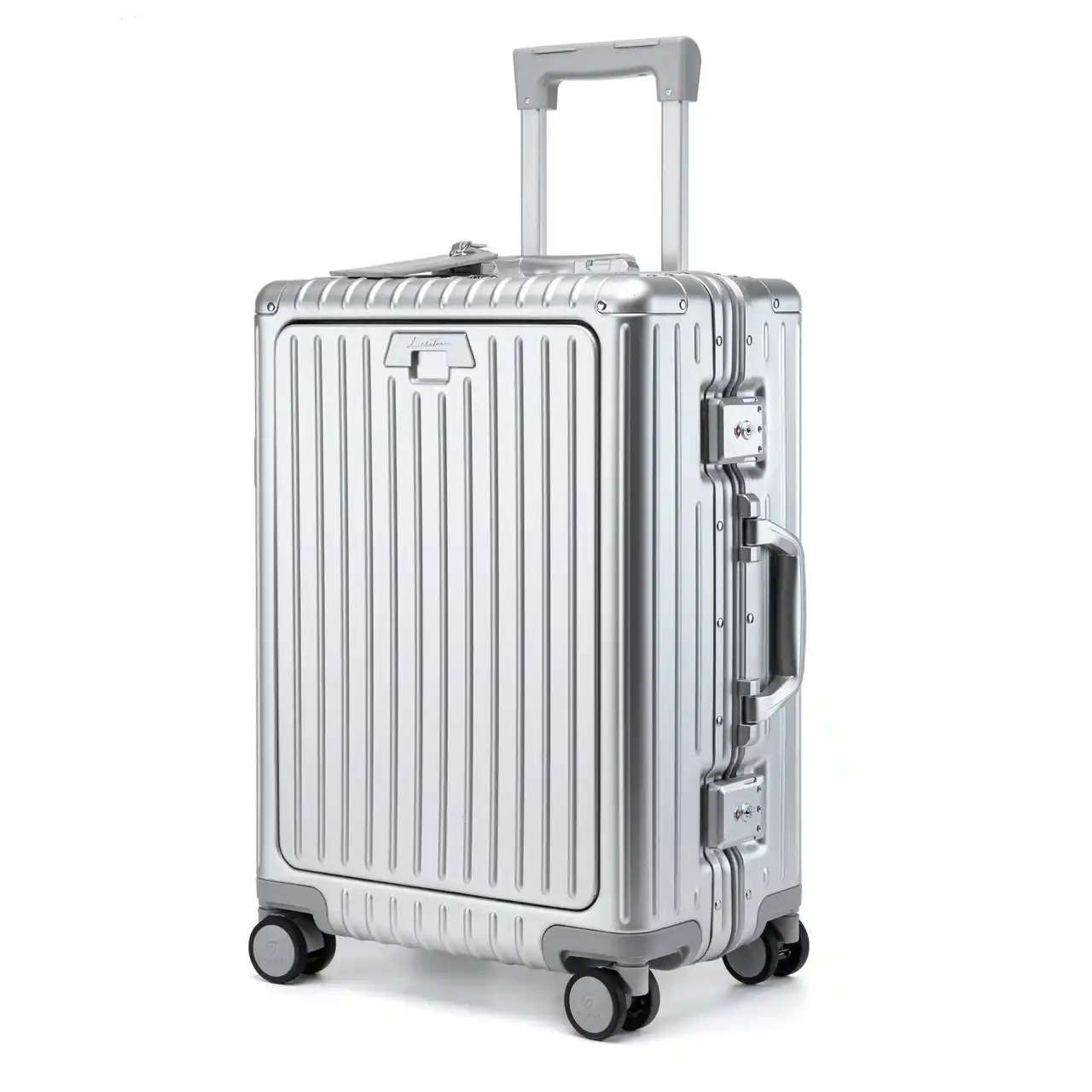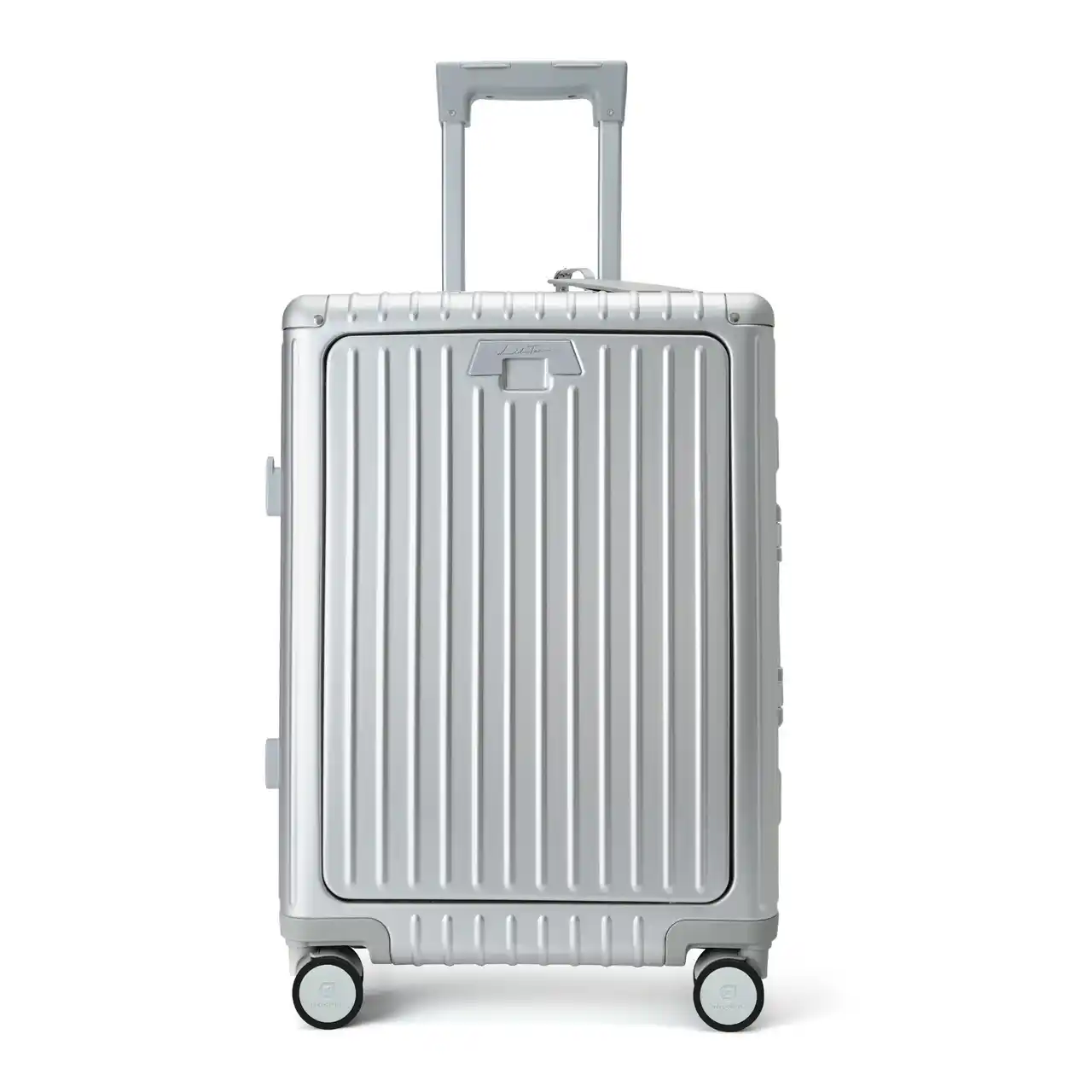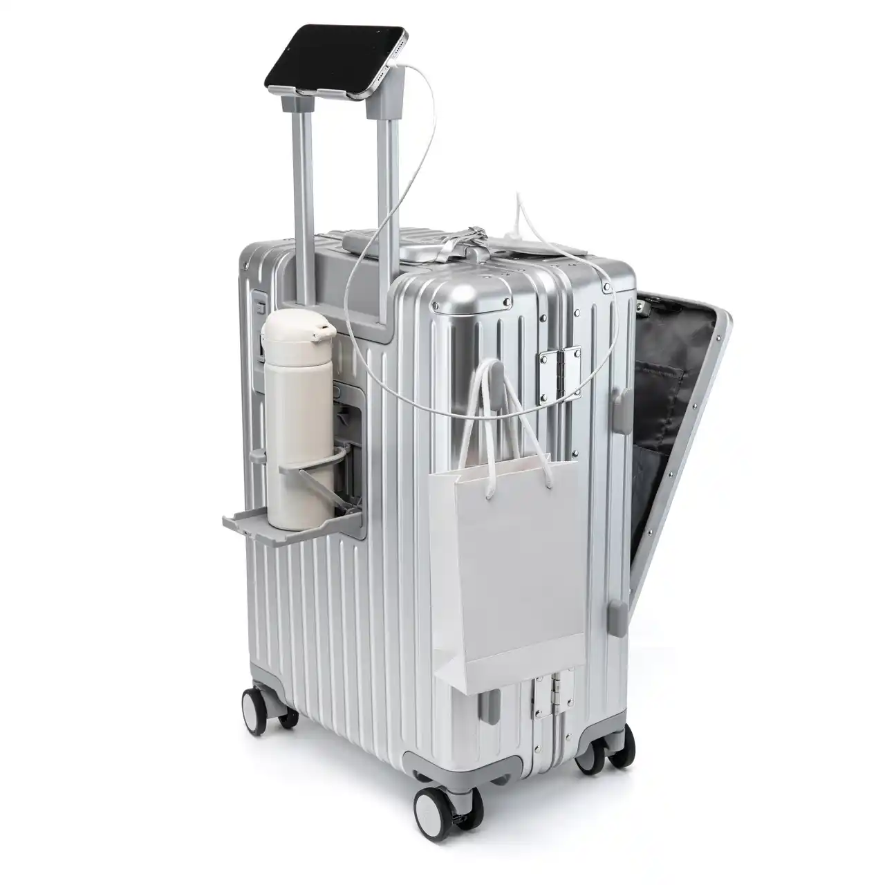本製品は、圧倒的な堅牢さと重厚感を備えるフルアルミニウムボディを採用しながら、従来のアルミ製スーツケースでは構造制約から難しかった多機能装備(フロントオープン、USB充電ポート、ドリンクホルダー、スマホスタンド)を実現しました。 |