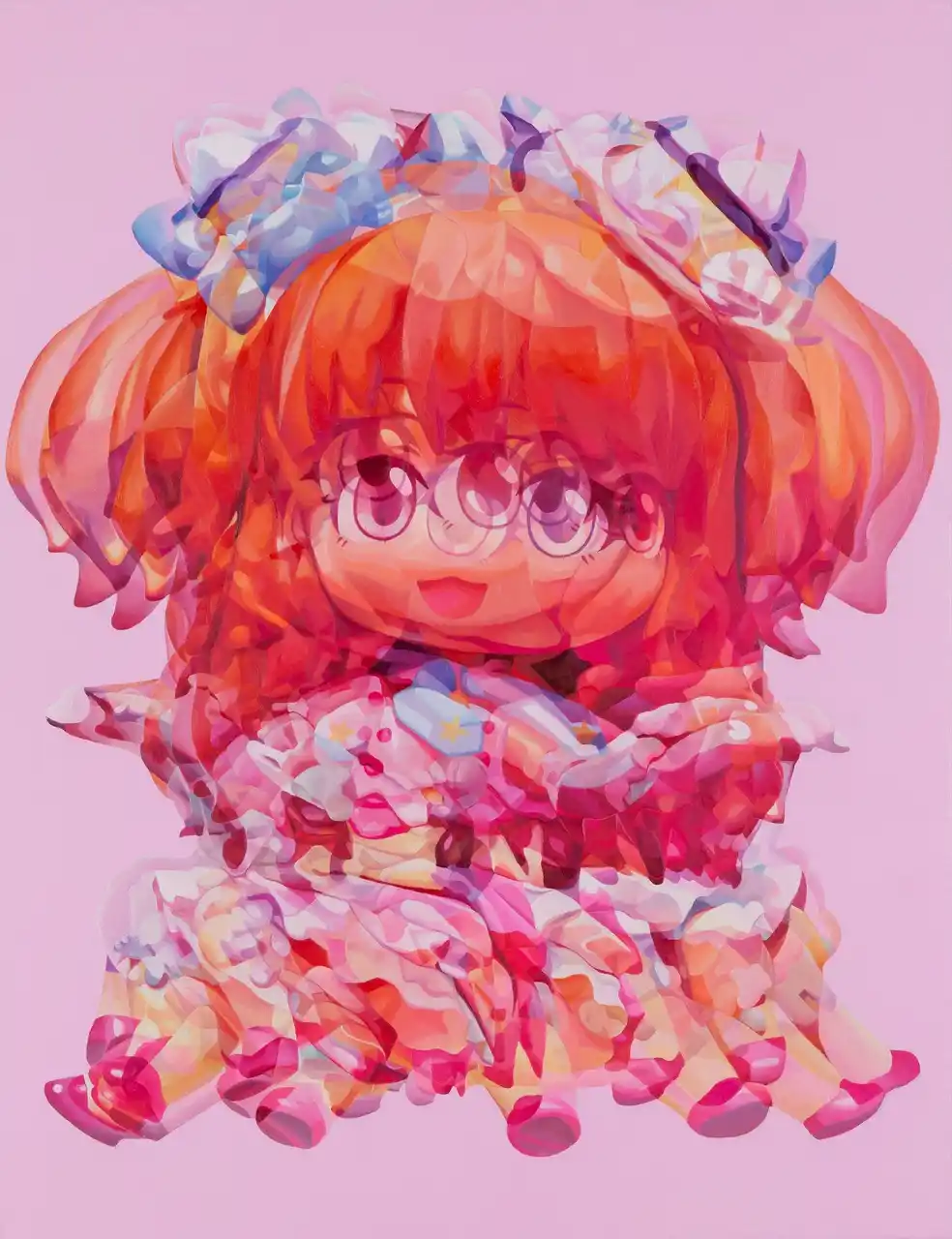 | 東麻奈美は「回転」というモチーフを起点に、フィギュアを回転させながら撮影した複数の瞬間を再構成することで、一つの画面の中に時間の連続や視点の移動を組み込みます。重なり合う残像のようなイメージは、動きの軌跡や時間の積層を視覚的なリズムとして画面に定着させます。 | |||||||||