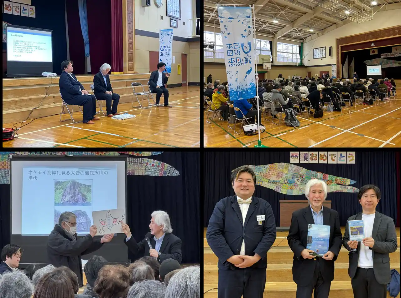 上映後には、地質学の松田義章氏と地域史研究者の高野宏康氏、沼田心之介アニメ監督を交えたトークセッションを実施。沼田監督は、断崖絶壁に佇むオタモイ地蔵尊への過酷なロケハンのエピソードや、このアニメの特徴を明かしました。 |