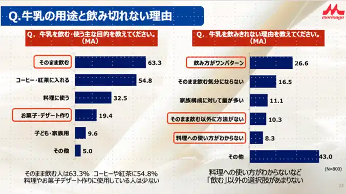 牛乳を飲み切れない理由としては「飲み方がワンパターン」「そのまま飲む以外に方法がない」「料理への使い方がわからない」と 飲む以外の選択肢があまりないと感じている人が多いことが浮き彫りになりました。 |
