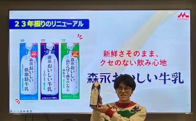 その味わいを実現するための「一般的な殺菌製法との違い」や「おいしさの科学的分析」など、「新鮮な生乳に近いクセのない飲み心地」を支えるこだわりが語られました。そして、2003年の発売以来、23年ぶりのリニューアルとなる今回は、1.利便性の向上 2.デザインの刷新 3.賞味期限の延長という3つのリニューアルポイントが発表されました。 |