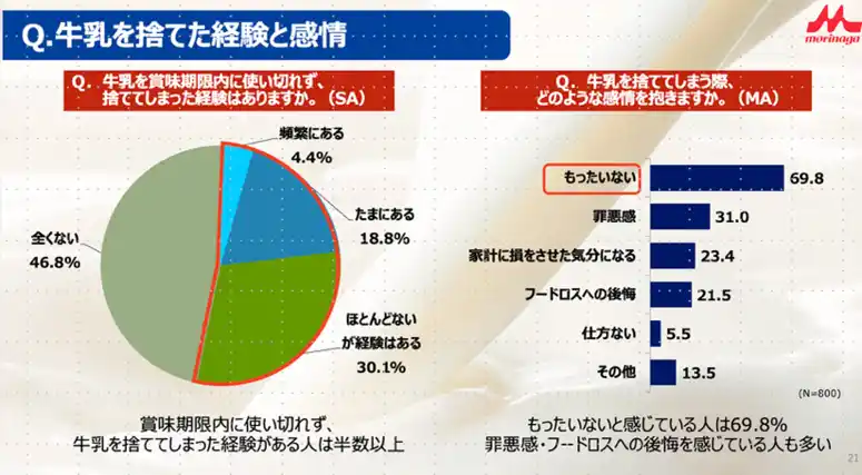 続いて、牛乳を捨てた経験と感情を聞いたところ、賞味期限内に使い切れず、牛乳を捨ててしまった経験がある人は半数以上でもったいないと感じている人は69.8%、罪悪感・フードロスへの後悔を感じている人も多いことがわかりました。 |