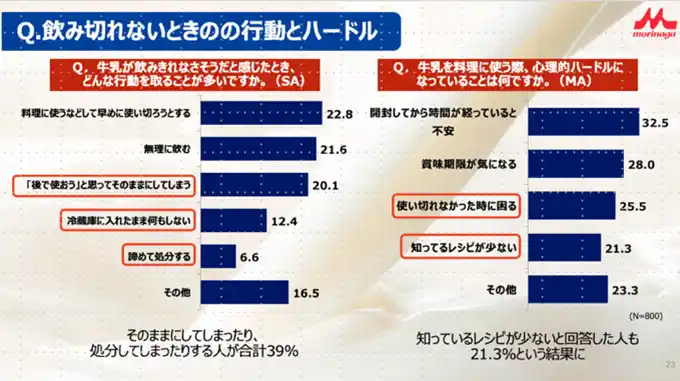 最後に、飲み切れないときの行動とハードルとして、牛乳が飲みきれなさそうだと感じたとき、そのままにしてしまったり、処分してしまったりする人が39%いることがわかりました。「牛乳を料理に使う際、心理的ハードルになっていることは何ですか」という質問に対しては、知っているレシピが少ないと回答した人も21.3%という結果になりました。 |