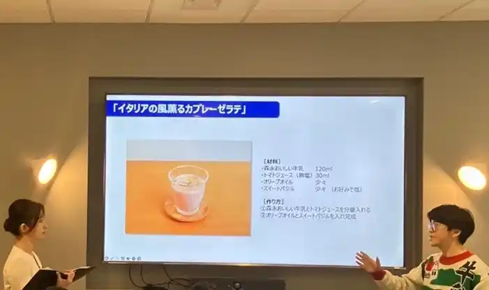 イベントの終盤には、会場に集まったメディア関係者の手元へ『イタリアの風薫るカプレーゼラテ』の材料が配られ、記者自身がその場でグラスに注いで作り、試飲する体験企画を実施しました。「注いで混ぜるだけ」という驚きの手軽さを記者自らが体感しつつ、トマトの酸味と牛乳のコクが織りなす絶妙なハーモニーを味わいました。 |