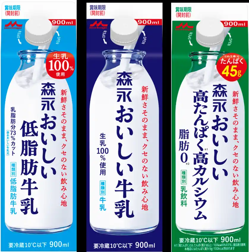 牛乳の利用シーンが多様化し、1回あたりの消費量が減少しているという調査結果を踏まえ、内容量が900mlと450ml(高たんぱく高カルシウムは900mlのみ)の新容量に変更されました。 |
