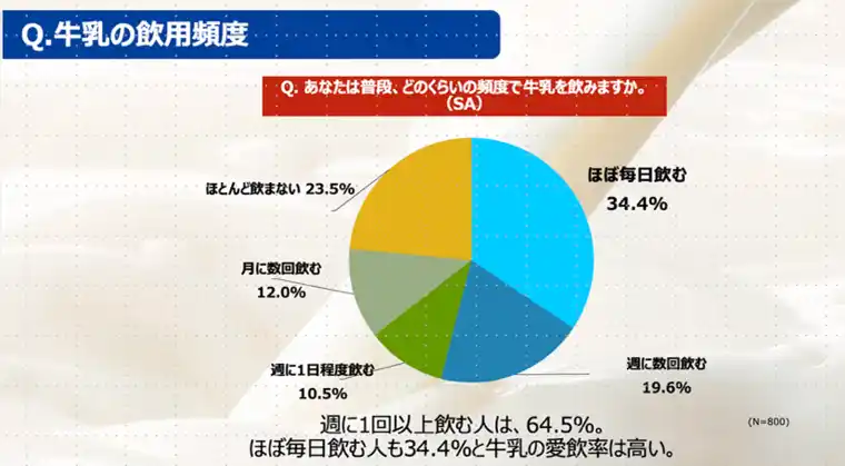 2026年2月に森永乳業が独自に調査した「牛乳に関する生活者の意識調査」では、週に1回以上飲む人は、64.5%。ほぼ毎日飲む人も34.4%と牛乳の愛飲率は高い結果となりました。 |