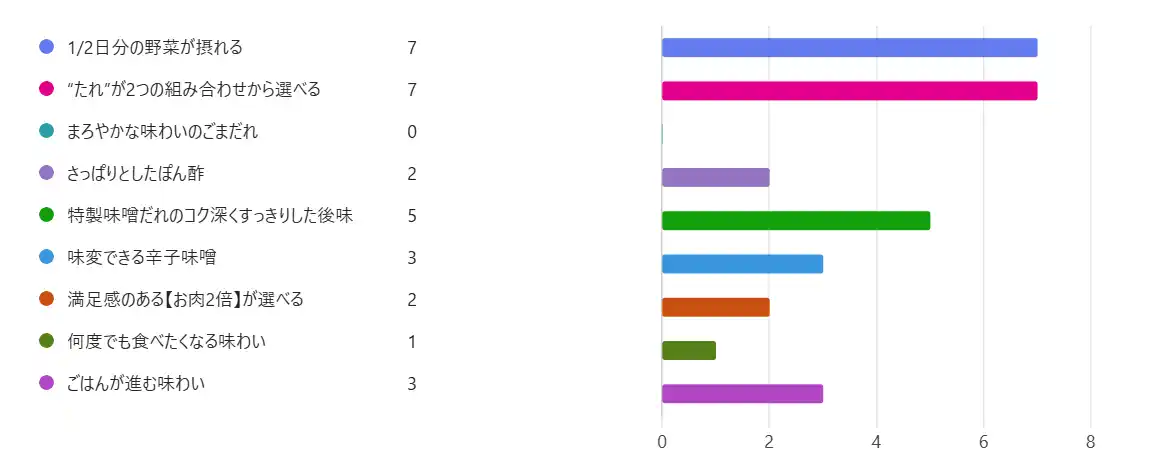 調査の結果、「1/2日分の野菜が摂れる」「“たれ”が2つの組み合わせから選べる」というポイントが同率1位でした。たっぷりの野菜を手軽に摂れる点に加え、気分や好みに合わせて“たれ”を選べる楽しさが支持を集める結果となりました。 |