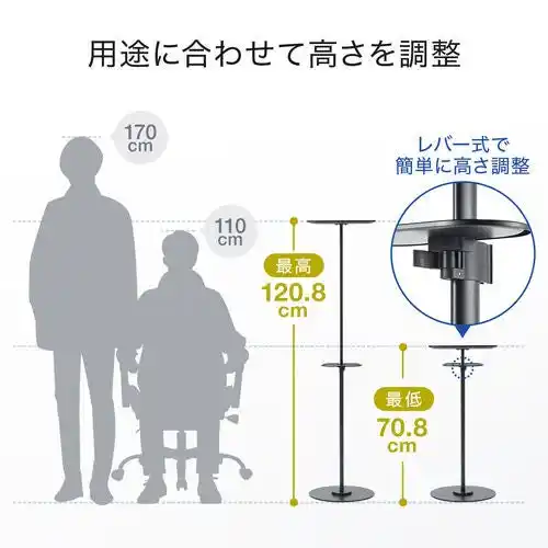 | 本製品はレバー操作で高さを約70.8~120.8cmまでスムーズに調整可能です。設置場所や投影する壁面・スクリーンの高さに合わせて最適な位置に設定できます。工具不要で直感的に操作できるため、プレゼンテーションや映像投影など、シーンに応じたセッティングを素早く行えます。 | |||||||||
