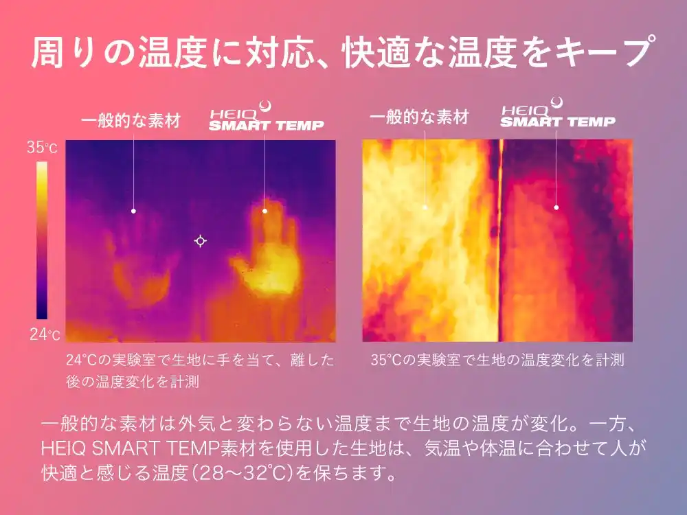 | 表地・裏地の両面にスイス発の革新的な技術「HeiQ Smart Temp」調温加工を採用しました。 | |||