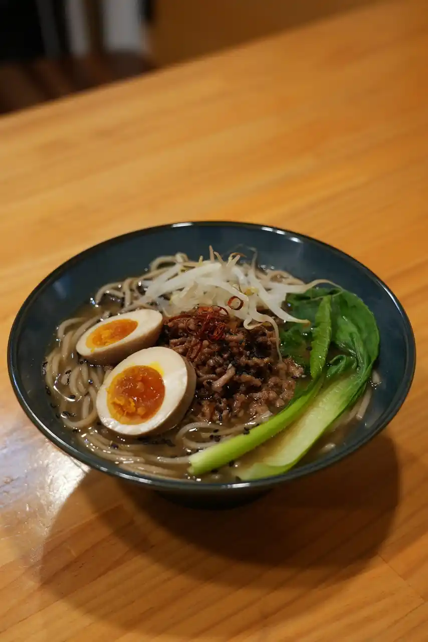 3. お皿に盛り付け、肉味噌・青菜・白髪ネギ・煮卵・もやしを盛る |
