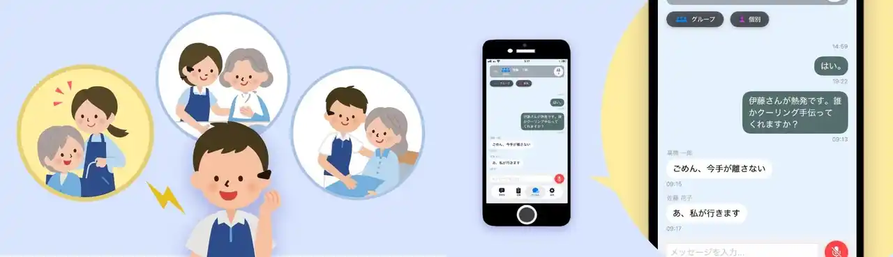 本サービスは、2025年5月のリリース以来、多くの介護事業所で導入されている「ほのぼのVoice」の基盤を活用し、追加機材のコストを抑えながら「職員間の音声通話」と「会話の自動テキスト保存」を可能にするものです 。 |